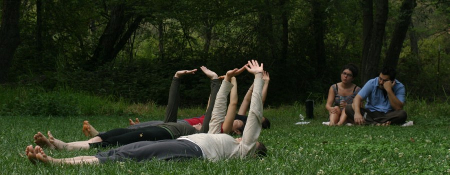 Erik read Heidegger’s essay “Overcoming Metaphysics,” prompting Jeff to read some John Dewey. In the afternoon Carolyn gave a presentation on “courage and awesomeness” in contemporary music. Before dinner Marcia, Paola, Carolyn, and Adrian performed Primary Accumulation in the meadow. After dinner there was a musical performance—Erik and Jeff played the two Louanges from Messiaen’s Quatuor pour le fin du temps as well as the premiere of an untitled duo by David; Jeff and Juan Cristóbal performed Steve Reich’s Clapping Music. Then there was a group reading of Cole’s libretto for a Western opera. Then all went down to the barn, where Tom, with Anjee’s assistance, had prepared a video projection. At night, after some participants had left, there was one further film viewing, of Jacques Tourneur’s I Walked with a Zombie (1943).